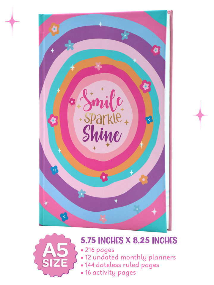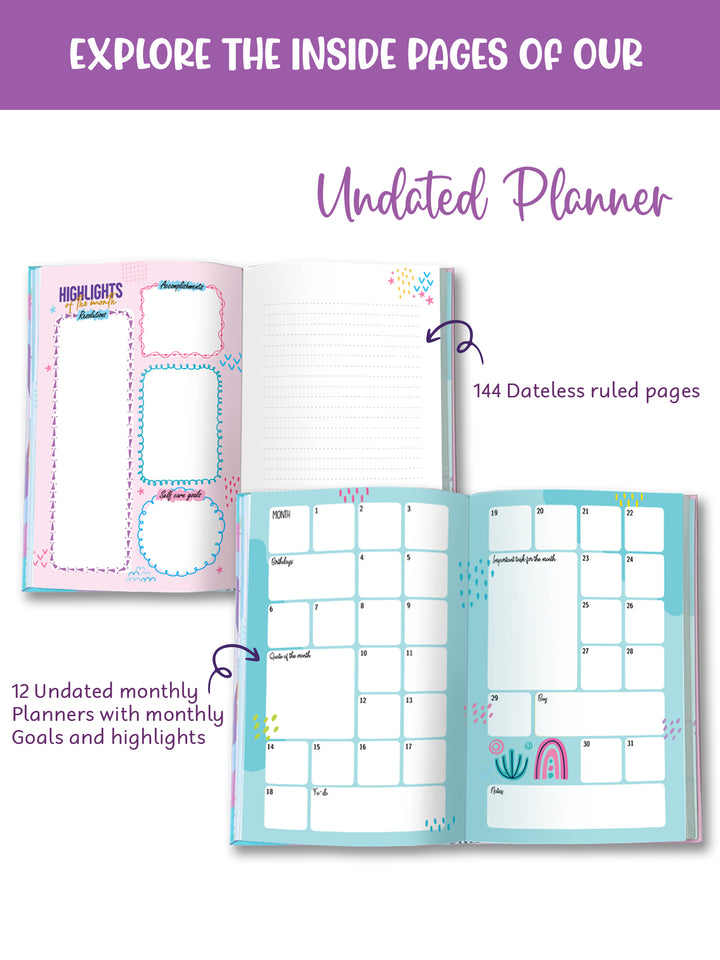 A5 Hardbound Planner: 216 pages, 12 undated monthly planners, 144 dateless ruled pages, and 16 activity pages for reflection, goal-setting, and progress tracking.