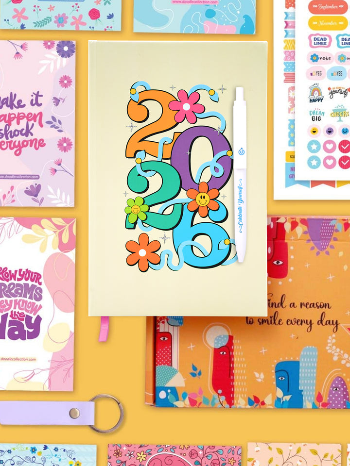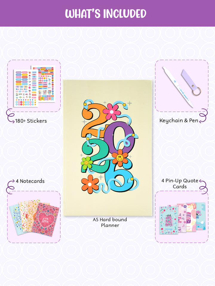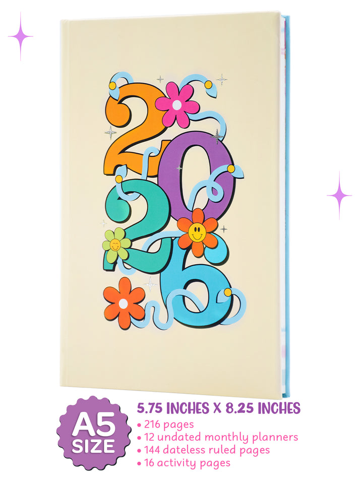 A5 Hardbound Planner: 216 pages, 12 undated monthly planners, 144 dateless ruled pages, and 16 activity pages for reflection, goal-setting, and progress tracking.