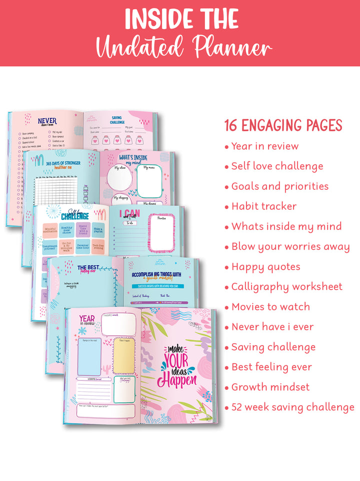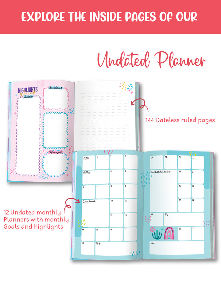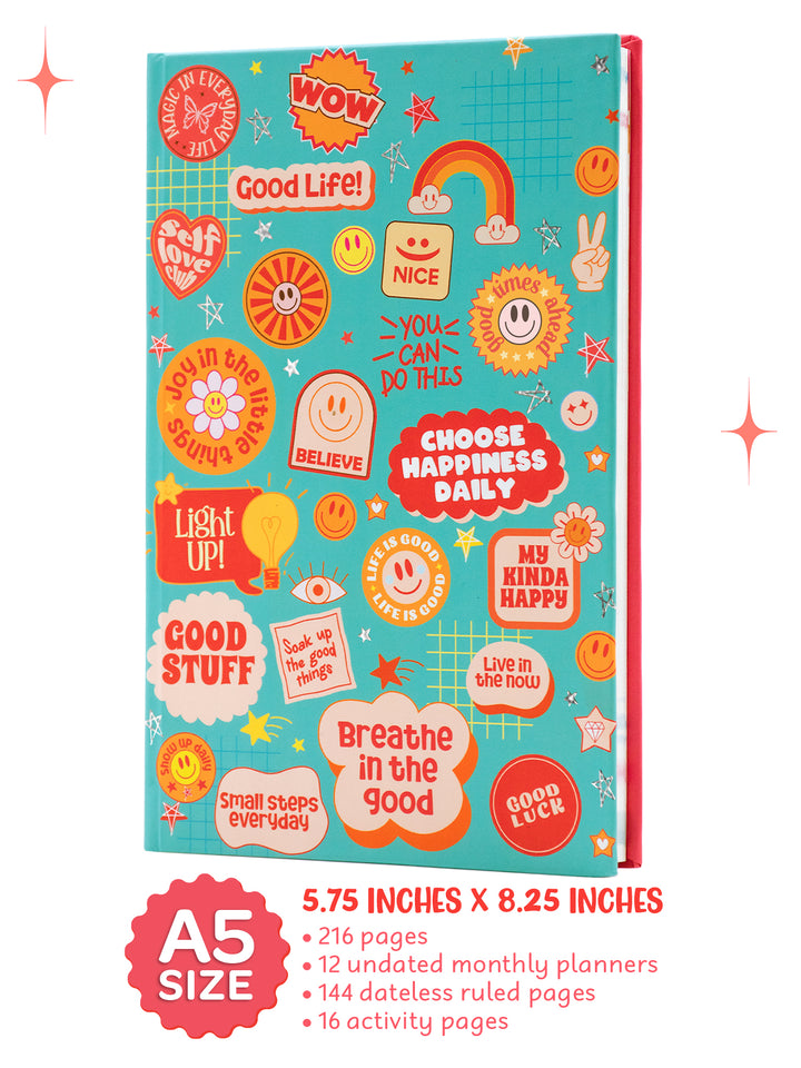 A5 Hardbound Planner: 216 pages, 12 undated monthly planners, 144 dateless ruled pages, and 16 activity pages for reflection, goal-setting, and progress tracking.