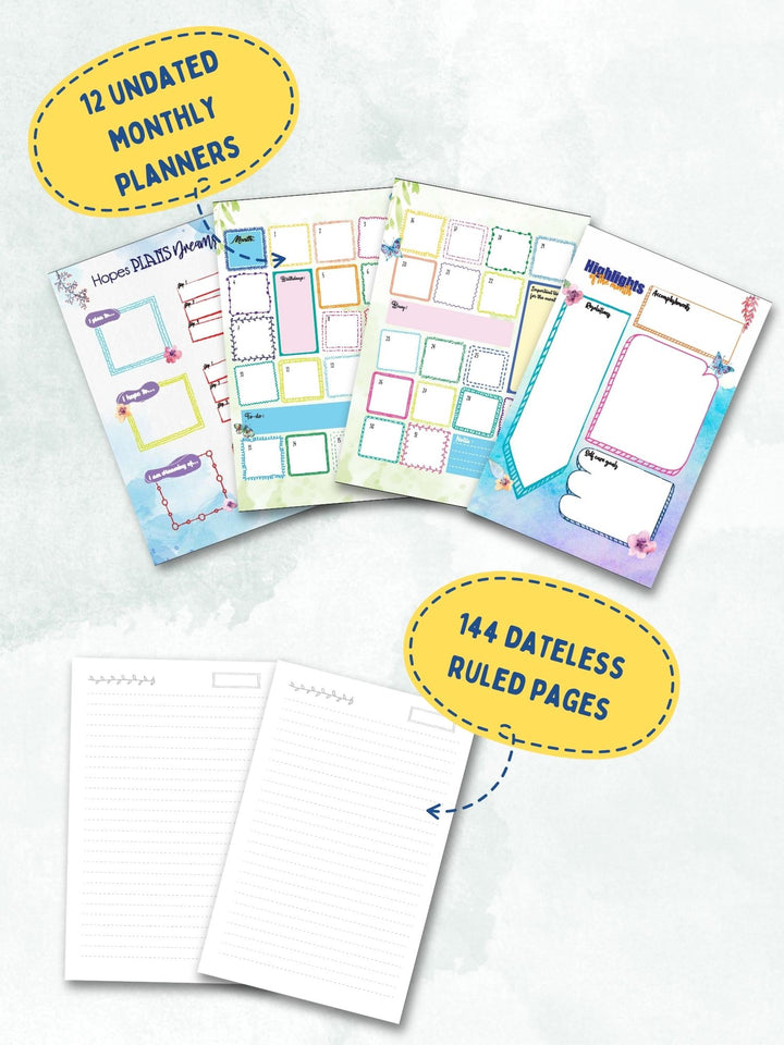 - YEARLY, MONTHLY, DAILY PLANNER DIARY : With 12 undated monthly planners and 144 dateless ruled pages, this planner allows for flexible planning and goal setting.