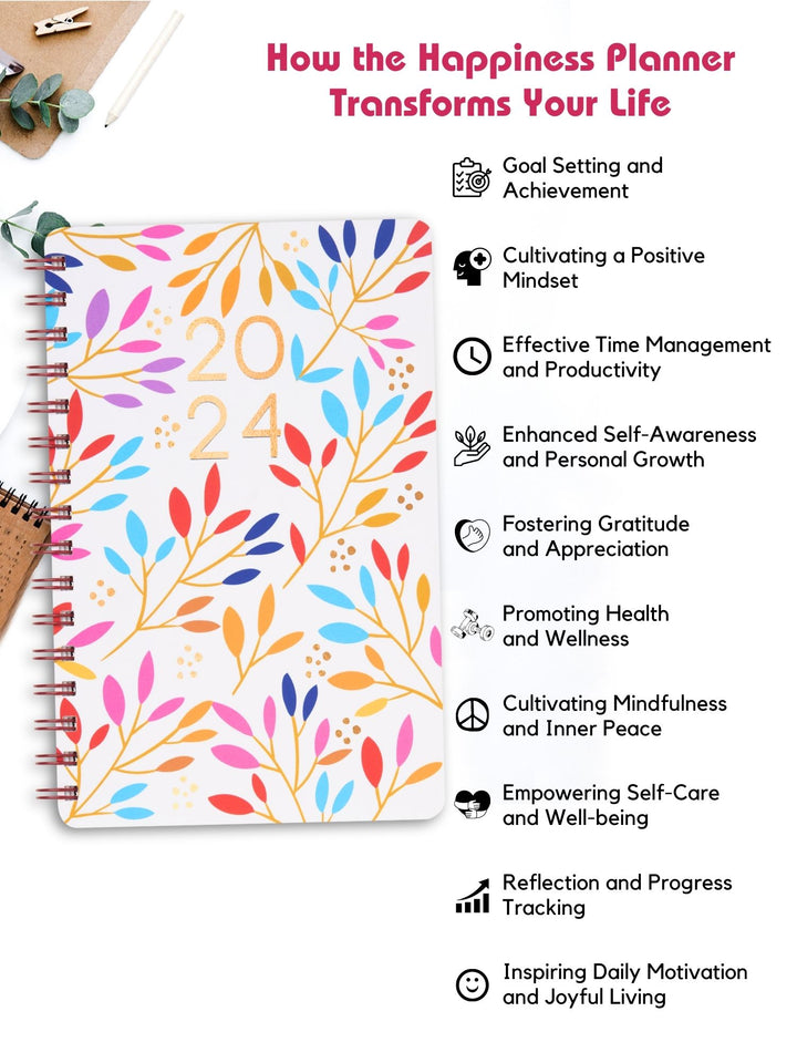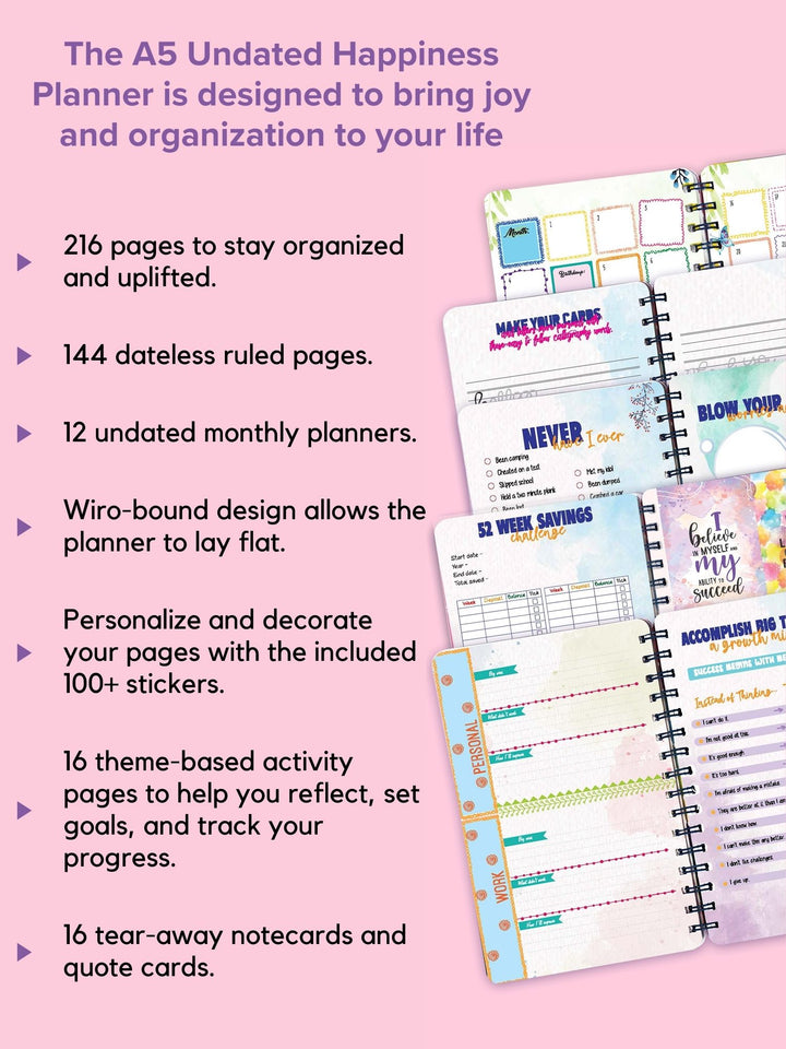 The A5 Undated Happiness Planner is designed to bring joy and organization to your life. With its wiro-bound design, it lays flat for easy planning and writing. The planner includes 100 stickers to personalize and decorate your pages. It features yearly, monthly, and daily planner sections, allowing for flexible planning and goal setting. The planner also includes 16 pages of theme-based activity pages to help you reflect, set goals, and track your progress. Additionally, there are 16 tear-away notecards and quote cards for inspiration and motivation. Start anytime with its undated pages. This planner has a total of 216 pages and is made with high-quality 80 GSM paper. Stay organized and uplifted with the A5 Happiness Planner.