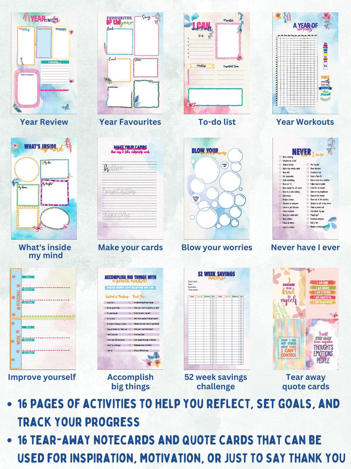 - Fun Activity Pages: Dive into 16 pages of theme-based activities that help you reflect, set goals, and track your progress.