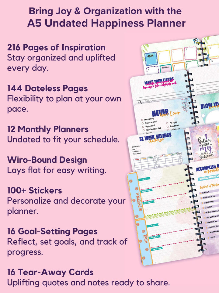 Ready to get organized and boost your mood? The A5 Undated Happiness Planner is here to bring joy to your daily routine. Whether you're planning your day or dreaming big, this planner keeps life on track and adds a splash of fun. It’s also a wonderful gift for anyone looking to brighten their life! With its creative features and fun design, it’s the perfect companion for planning with a smile.