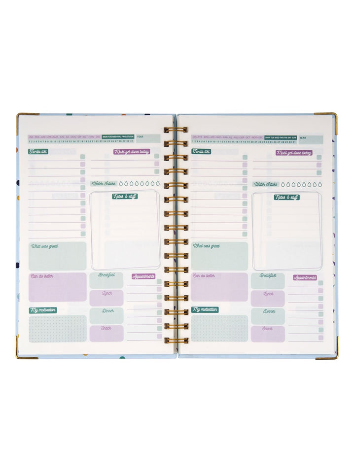 This A5 size hard-bound planner is perfect for keeping track of your daily life. It features 192 colourful pages, themed around daily planning, start anytime undated, and metal corners for extra durability. The A5 size (5.5*8.5 in) ensures that it fits in almost any bag. Keep your life organized with this stylish planner!