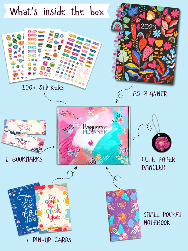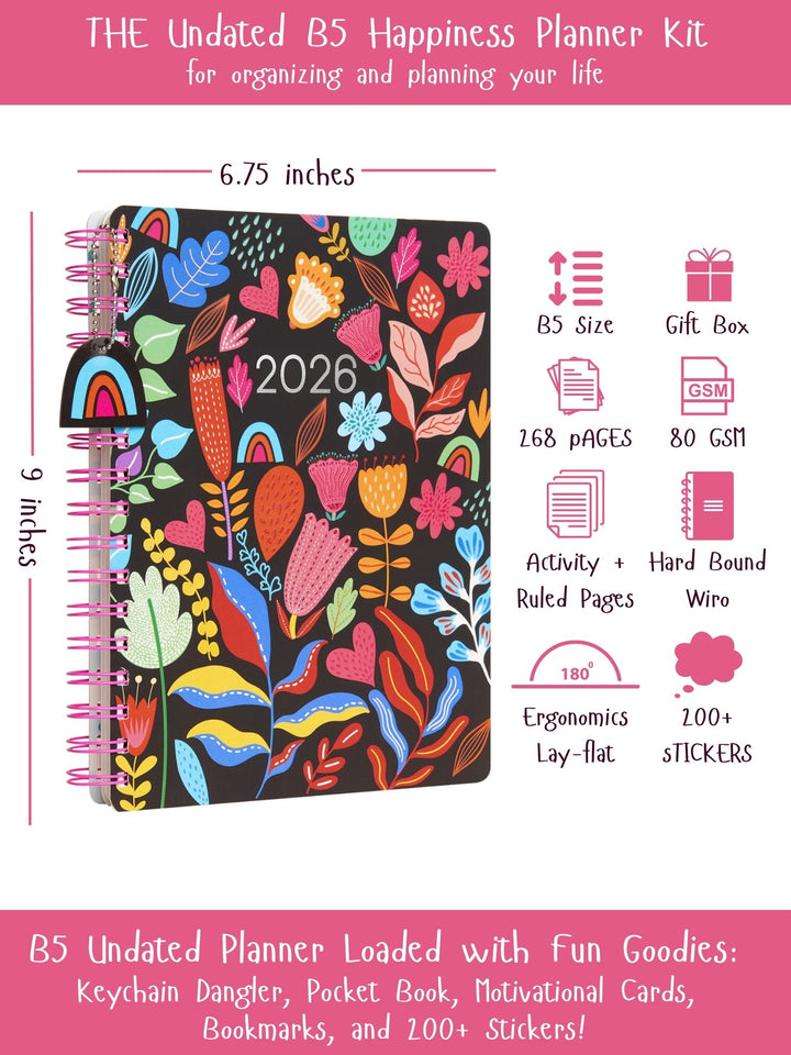 Say hello to the B5 Happiness Planner Kit, your ultimate sidekick for getting organized and staying inspired. Whether you're starting fresh at the beginning of the year or jumping in whenever you feel like it, this planner's got your back. It's packed with everything you need to keep your life on track and add a dash of fun to your routine. Whether you're treating yourself or gifting it to someone else, this planner is the perfect companion for anyone looking to brighten their days.