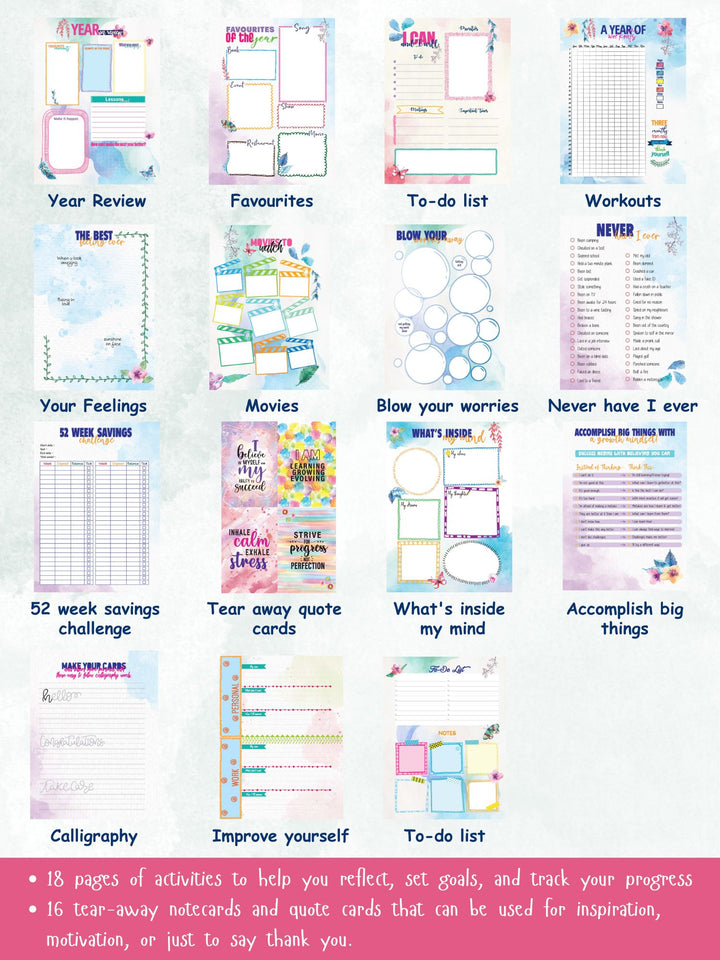 - Activity Pages for Your Goals: Dive into 18 activity pages that help you reflect, set goals, and track everything from workouts to movie nights.